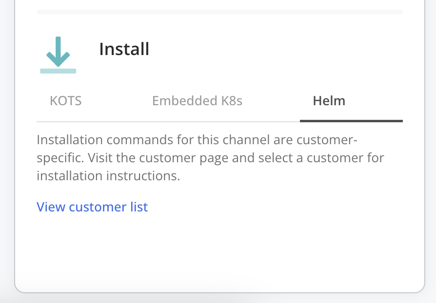 noteThe Helm installation instructions are customer-specific. Click View customer list to navigate to the page for the target customer. For more information, see Get Customer-Specific Installation Instructions for Helm or Embedded Cluster below.